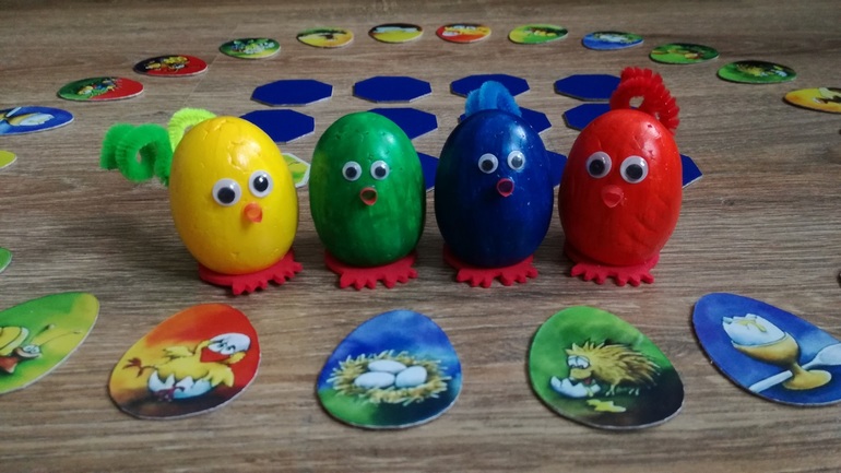Цыплячьи бега - очень популярная игра у детей 3-7 лет. Я писала об игре подробно здесь на радостях от того, что наконец смастерила её. Цыплята прыгают с яйца на яйцо по часовой стрелке, и для каждого последующего шага игроку нужно найти среди лежащих в центре поля жетонов такое же изображение, как и на яйце, на которое предстоит перепрыгнуть. В начале игры дело идёт медленно: всякий раз по очереди и без особого успеха пытаемся найти нужную картинку, перебирая все подряд. Но понемногу отдельные изображения начинают запоминаться сами собой, безо всяких мнемонических приемов даже. И, если повезёт, за свой ход твой цыпленок сделает не один, а 3-5 прыжков подряд, что начинает нервировать соперника)) Потом в памяти откладываются почти все жетоны, и передвижение становится прямо-таки стремительным, но одна перепутанная картинка - и всё, стоишь и ждёшь, догонят ли тебя, выдернут ли перо из хвоста. Азарт - как в настоящих догонялках. Втроём всё-таки лучше, поскольку игра не заканчивается после первого же обгона. Хит!