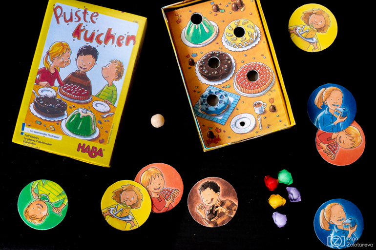 Puste kuchen (Воздушные лакомства) Haba. Самодельная версия, несколько куцая из-за того, что главный реквизит - пробковый шарик - я пока не нашла. Играем с деревянным (в оригинальной версии он тоже есть, но из-за разницы в массе играть с ним сложнее - это вроде как для опытных игроков). Это игра на развитие артикуляционного аппарата: нужно задувать шарик в одну из нескольких лунок на игровом поле - коробочке. Можно в любое, но лучше прицеливаться - тогда выигрыш будет более вероятным. Удивительно, но у дочки получается лучше, чем у меня, даже с учетом тяжелого шарика.