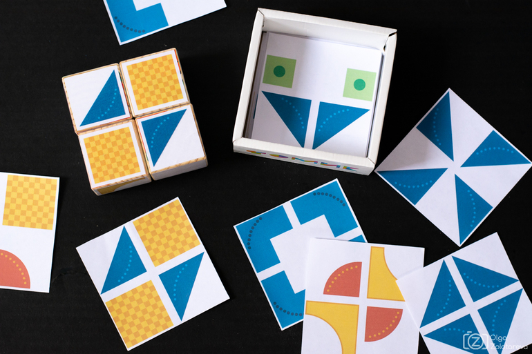 Недавно появились у нас кубики - самодельный вариант игры от Goki. По сути, усложненный вариант кубиков Сложи узор и аналог всевозможных кубиков в картинками на гранях. Из-за абстрактных картинок игра является непростой для нас.
