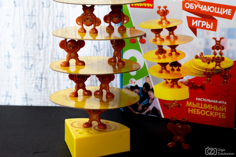 Другой балансир - Мышиный небоскреб от Bondibon. Учимся возводить многоэтажные конструкции, пока не куплена "классика жанра" - Суперносорог Haba. По правилам игроки по очереди стоят небоскреб, укладывая по два мышонка на специальные метки и заканчивая круглым перекрытием. Разваливший башню получает штрафной жетон. У Леденца получается пока стоить 4-5 этажей из семи возможных, потом конструкция рушится. Начали играть с трёх лет с небольшим, но более или менее получаться стало уже ближе к четырём.