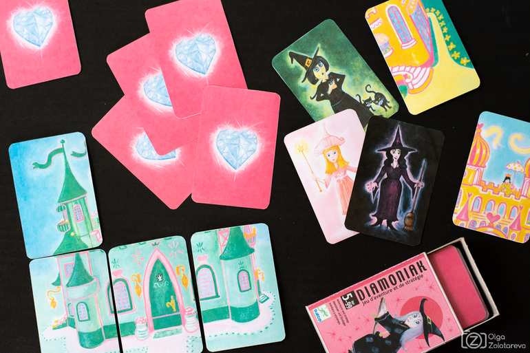 Построй замок - ну и ещё одна карточная игра а-ля Djeco. Изготавливалась на подарок, потом планы поменялись, и коробочку я планировала отложить на годик-полтора (производитель рекомендует игру на возраст 5+). Но вышло так, что дочка обнаружила игру вскоре после трёх с половиной лет, и этот факт совпал с началом увлечения разными принцессами, замками, феями и т.п. Так что пришлось знакомиться с игрой досрочно, и оказалось, что игра довольно простая и увлекательная для маленькой девочки. Поначалу, правда, она боялась, что выпадет карта колдуньи, но игра сбалансирована так, что в большинстве случае от колдуньи довольно легко откупиться, не разрушая строящийся замок (а можно убрать пару карт колдуний из колоды, и играть будет совсем безмятежно). Из карточных игр именно эта - одна из самых любимых вот уже полгода.