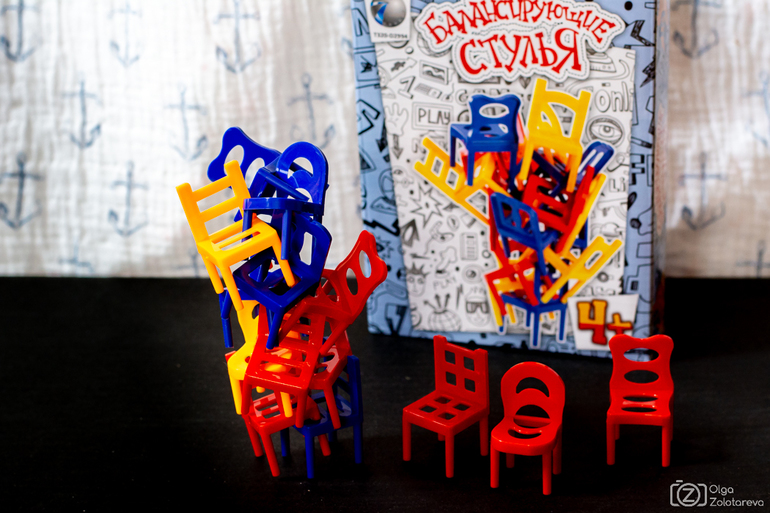 А это новые игры, которые появились у нас после трёх лет. Балансирующие стулья (аналог известной Mistakos) играются с трёх с половиной лет: не очень просто, но весьма занимательно. Взрослые тоже не прочь поупражняться в сольном возведении башни.
