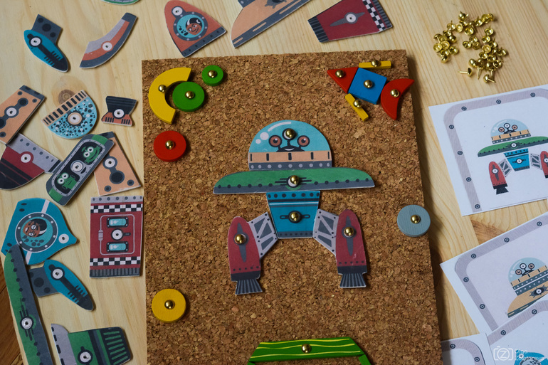 Аналог Geoforme, DJECO, от Лесной фантазии тоже в ходу. Опять же, шаблоны в меньшей степени интересны, чем сочинение своих сюжетов. Чудо молоток от Степпазл появилась в возрасте около 3,5 лет. Деталей в мозаике очень много, и это стимулирует творческую игру с увлечением, хотя тот факт, что детальки нужно прибивать молотком, а не просто прикладывать (как в магнитной), тормозит полёт фантазии)) На фото мозаика вместе с дополнением - Космодром (там шаблоны, ограниченный сюжет - всё, что дочь не любит).