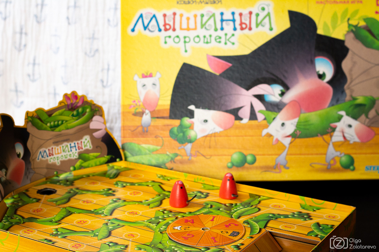 Мышиный горошек - дешевая и объемная (даже слишком) игра. Ходилка с запоминанием (нужно помнить всю игру, под каким мышонком прячется горошинка нужного цвета), по механике повторяющая во многом знаменитую и дорогую Лестницу привидений от Drei magier. Наверное, я сделаю и оригинальную версию для нас и буду хранить их в одной коробке. Пока хватает и Мышиного горошка: дочка увидела его на полке в 3,8 и не успокоилась, пока не сыграли пару партий, с тех пор игра "вошла в обиход". К игре прилагается три варианта правил: простой с обычными ходами-продвижениями и перестановкой мышек, более сложный с возможностью менять местами не только мышей, но и жетоны, показывающие, какой цвет игроку нужно привести к победе. И третий вариант - игра на ловкость со ставками. Мы начинали с первого варианта, потом перешли ко второму: при игре вдвоем дочка часто выигрывает, втроём уже настоящая путаница получается.