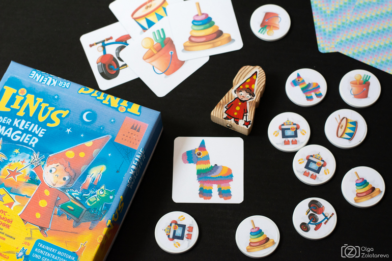 Линус - маленький волшебник. Простая игра от Трех магов (Drei magier). Наверное, уже не выпускается, т.к. кажется, я встречала её в обзоре лишь единожды и очень давно. Игрокам нужно помочь маленькому волшебнику Линусу вспомнить, какие из его многочисленных игрушек заколдованы, а какие - нет. Для этого нужно переворачивать по одной квадратные карточки с изображениями игрушек и, поднося магнитную фигурку волшебника к жетону игрушек с таким же изображением, найти "заколдованное" (магнитное). Карточек в игре - по три для каждой игрушки, все карточки перемешиваются перед началом игры. Фишек - по пять для каждого вида игрушек: три магнитятся и две - нет. Игра самодельная, по мотивам, как говорится. Для жетонов я использовала пластиковое лото, приклеив на термоклей шайбы из строймагазина с обратной стороны. Линус снабжен неодимовым магнитом.