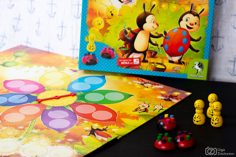 Маскарад божьих коровок был подарен дочке на Новый год, в 3,9. У меня с этой игрой особая любовь, подкрепленная хитрым способом покупки и долгим ожиданием, пока дочка до игры дорастёт. Любовь моя передалась целевой аудитории: играем довольно часто и всегда с удовольствием, продолжая партию маленькой ролевой игрой. Фишка игры - в магнитных божьих коровках, которые, в зависимости от полярности, то отталкиваются друг от друга, то притягиваются (и в этом случае обмениваются разноцветными пятнышками - деревянными штырьками). Нужные пары божьих коровок можно вычислить и запомнить, поэтому у игры якобы мемори-механика. Но дочка даже и не пытается запоминать пары жучков, кажется. Проигрываем из-за этого нередко, но не огорчаемся))