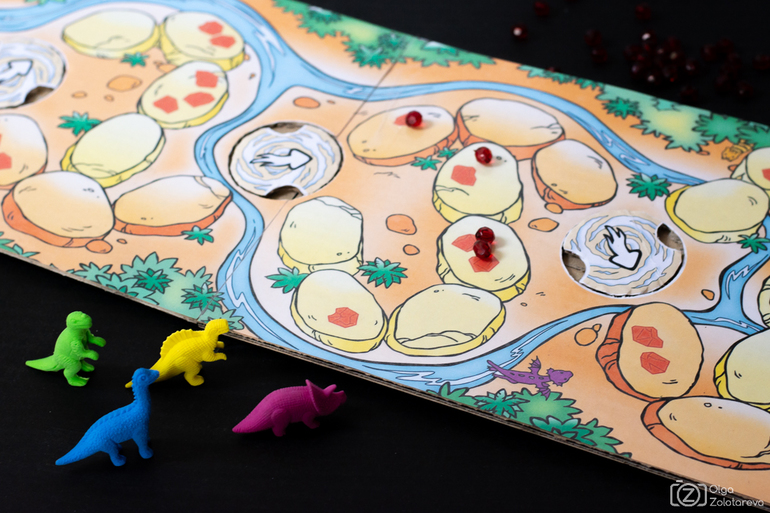 Дракон Гром-зубастик. Игра на три года, а то и немного раньше (мы начали в 3,3 играть). Дракончики спешат к вулкану по дорожке из камней, собирая попутно кристаллы. В нескольких местах дорожки раздваиваются: вместо простого изображения камня - т.н. плитка "вихрь", указывающая стрелкой дальнейшее направление пути. Кто собрал больше кристаллов, тот выиграл. В этой игре двойное поле: нижний слой цельный, верхний содержит круглые прорези, в которые укладываются перед началом игры такие же круглые вставки. Кубик на фото не попал, на нём есть точки и два значка "вихрь", при выпадении которого нужно повернуть все вращающиеся элементы. Игра очень незатейливая, но хорошая, особенно если нагонять страстей, бурно озвучивая налетевший внезапно ветер)))