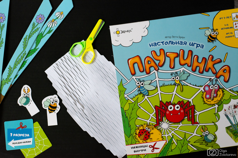 Паутинка от Эврикус тоже пошла бы и много раньше 3,9 лет (а именно в этом возрасте она была подарена). Других игр, где нужно работать ножницами, я не встречала, и потому прочила ей большой успех. Прямо большого успеха она, должна признаться, не имеет, но игруха занятная. Ножницы, идущие в комплекте, никуда не годятся, и мы используем свои обычные.