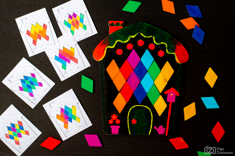 Года в 3,2-3,3 примерно я сделала мозаику по мотивам знаменитой Совы от Djeco, используя мозаику Смайл-декор в качестве основы, перекрасив отчасти ромбики и нарисовав шаблоны к ней. Потом уже я узнала, что на Алиэкспресс есть аналоги оригинальной мозаики, и можно было бы и сэкономить, и обойтись без лишнего труда. Но ничего: мозаика своё отработала.