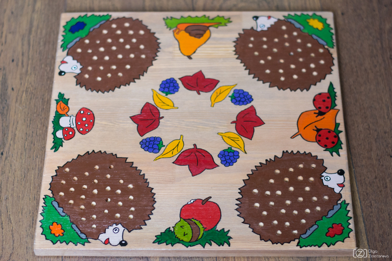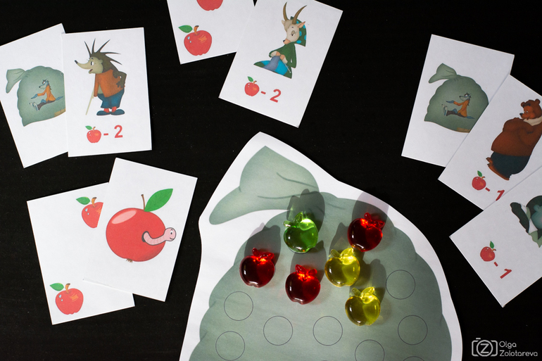 Мешок яблок - авторская игра по мотивам одноименного мультфильма. Открываем карты и, в зависимости от их значения, собираем яблочки (из фикс-прайса) в мешки, делимся с животными, опасаемся жадного волка. Играем в неё в трех лет. По сложности переросли очень быстро, но россыпь разноцветных яблочек так притягательна, что к игре мы то и дело возвращаемся. Возможно, и после четырёх лет будем.