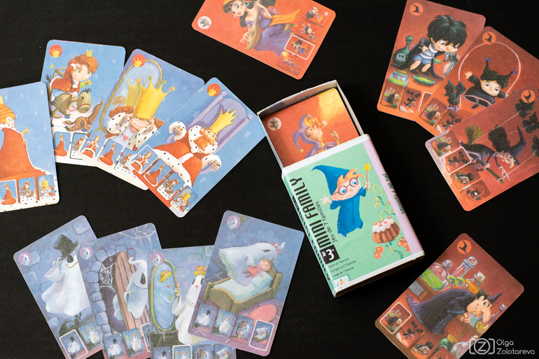 Начали с Mini family, Djeco. В ней 7 семей (Волшебники, Рыцари, Короли, Привидения и т.д.) по 4 персонажа в каждой (папа, мама, сын и дочь). Спрашиваем напрямую ("есть ли у тебя такой-то персонаж?"), подключаем к игре игрушки для массовости, постепенно учимся не показывать свои карты.