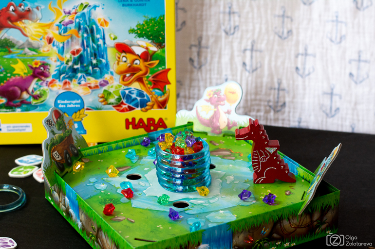 Сверкающее сокровище, Haba (или Дракончики в русской локализации) - не балансир ни разу в чистом виде, но определенная ловкость рук в игре не помешает, поэтому я отнесла игру в эту группу. Снимаем (растапливаем горячим драконьим дыханием) "ледяные" кольца по одному, собирая раз за разом освободившиеся разноцветные кристаллы. Игра ну очень простая и незатейливая, но при этом удивительно милая. Появилась она у нас в 3,10, а можно бы было начать играть намного раньше. После игры появилась традиция создавать разноцветные узоры из кристаллов.