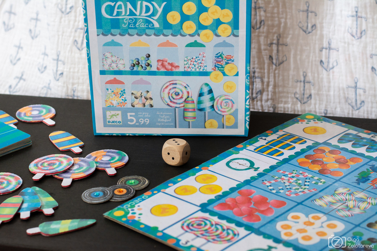 Candy Palace от Djeco. Тоже самоделка, как и все остальные в этой категории. На коробке стоит 5+, но с трех с половиной играть вполне можно (что мы и делаем). Не знаю, почему такой ценз выставлен, обычно Djeco адекватно выставляет возрастной ориентир. Тема леденцов и сладостей - одна из любимых у человека с домашним именем Леденец, что не удивительно. И игр это тоже касается. Игроки, бросая кубик, ходят по периметру игрового поля и попадают то на клетки с изображением конфет, то на на клетки с монетками, то на клетки с часами. В первом случае у игрока есть возможность купить себе леденец (если нужные есть в магазине, и есть деньги на это). Во втором случае можно добыть немного монеток для дальнейших покупок. В третьем - закрыть тайлом "жалюзи" одну из девяти ячеек в центре игрового поля. Когда раскуплены все конфеты или закрыты все центральные клетки, игра заканчивается, и идёт подсчёт леденцов. Очень девичья игра. Одна сложность с ней: дочка после партии норовит растащить конфетки для сюжетно-ролевой игры)))