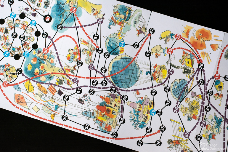 Приключения Незнайки - первая обычная ходилка, классическая, из детства. Насколько помню, именно эта версия (наряду с парой других) пользовалась большой популярностью у нас с друзьями лет этак в 8-10. Для неполных четырёх лет 80-шаговое поле, да ещё с периодическими откатами назад, да с пропусками хода - слишком долго. Поэтому до финиша так и не доиграли мы, даже используя два кубика сразу. Но берёмся за игру всё равно, потому что Незнайка с осени-зимы - наш самый любимый персонаж.