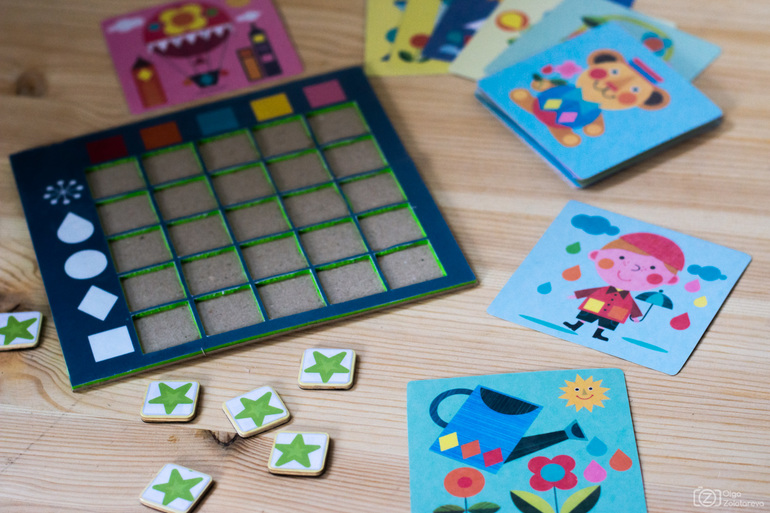 Мемори-игра с окошками от Bondibon у нас тоже до трёх появилась, и одно время играли в неё мы бесконечно, повторяя одни и те же любимые шаблоны. Несмотря на то, что поле всего 4*4 (8 пар картинок), некоторые шаблоны довольно сложные даже для взрослого. Можно сверстать и свои, при желании, на любую тему. У Bondibon появилась ещё одна версия этой игры, размеров 5*5 ячеек (как я поняла, одна не участвует - остается 12 пар). В новой версии карточек-шаблонов меньше.