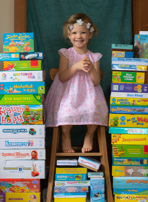 Коротко о тех, которые появились до трёх лет, и по-прежнему очень любимы. Это хит из хитов Da ist der Wurm drin (Червячки-огородники), который я всё не могу позволить убрать подальше, ведь дочка про игру то и дело вспоминает. Кролики и норы (аналог Выдерни морковку от Ravensburger), появившаяся у нас в 2,9, набиравшая игровую силу постепенно и к трём с половиной годам достигшая максимума по количеству сыгранных партий (на фото не попала). Кто быстрее? Проворный скворец от Дрофы-медиа, аналог Фруктового сада Haba, с ней мы познакомились до трёх лет, но длительность партии была слишком велика для малышки, а теперь уже по силам. И даже в версию для самых маленьких First Orchard (Мой первый фруктовый сад) мы играли до 3,8-3,9 где-то. Ещё с прошлого года перекочевали и не утратили популярности игры Tempo, kleine fische (Быстрее, маленькие рыбки) от Ravensburger, Aвтобусная остановка от Orchard Toys и Останови ветрянку, DJECO. Обо всех них я писала год назад.