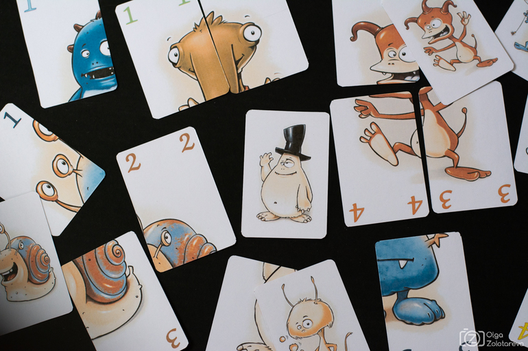 Семеек для малышей - огромное множество. Мне они кажутся однотипными и не интересными, между тем, помню, в своём детстве мы часами играли в эту игру с обычной колодой карт и обменом вслепую. Так что после успеха у дочки первой игры я распечатала вслед вторую - Monster mix. В ней нужно собирать монстрика из четырех частей как пазл, причем не сразу понятно, какая карта к какому чудищу относится.