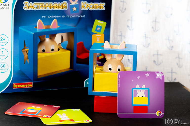 В прошлом году я писала про Катамино, Ubongo Junior (не головоломка, на самом деле, но у нас повелось именно так), кубики Сложи узор, блоки Дьенеша - все эти игры с нами в описанном выше режиме. К танграму в этом году не возвращались. Открытые незадолго до трехлетия игры Smart Games (Камелот для малышей, Красная шапочка и Смарт тачка - все 4+) были дополнены купленным, наконец, Застенчивым кроликом (2+ на коробке, у нас с 3,2 лет) и Тремя поросятами (самоделка, 3+, у нас с 3,3 где-то). Не спрашивайте, почему игры более старшей возрастной маркировки появились в арсенале раньше тех, что рассчитаны на более ранний возраст))) К слову, поскольку игры отличаются друг от друга по сути предлагаемых заданий, простота/сложность их определяются не столько возрастным ориентиром, сколько индивидуальной предрасположенностью ребенка к тому или иному типу заданий. В нашем случае, по крайней мере, так. Красная шапочка на построение дорожек идёт лучше всего, с самого начала дочке давались первые задания, и сейчас она неплохо справляется в более сложными. Три поросенка идёт хуже: до середины лишь дошли. Смарт тачка для дочки самая сложная - её на время вообще отложили. Кролик, хоть и позиционируется для как игра для двухлеток, был пройден чуть ли не с боем к возрасту 3,8. Камелот примерно на уровне Трёх поросят, но идёт чуть веселее благодаря интересной теме.