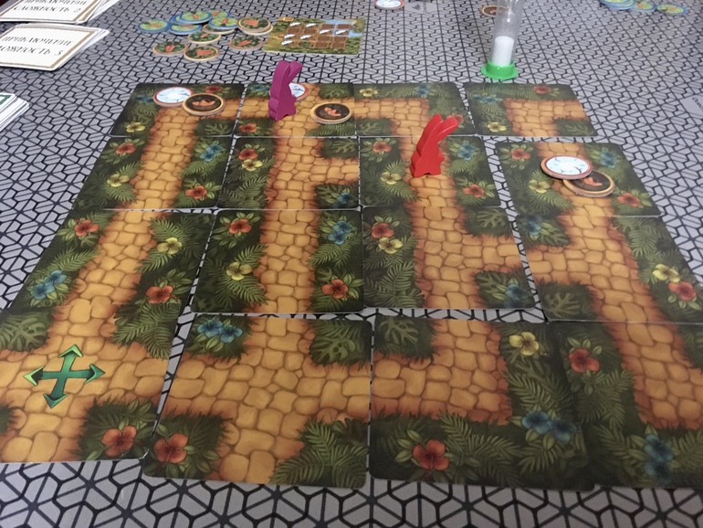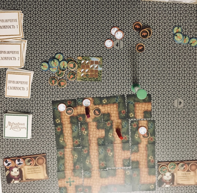 До этого я смотрела обзор в ютюбе, с правилами разбираться вообще не пришлось, сразу приступили к партии. Морковный лабиринт- кооперативная игра. Состоит из трёх фаз: фаза построения лабиринта, фаза сбора морковки и завершающая - фаза выхода из лабиринта. В первую и последнюю фазу в игру вступают песочные часы, которые ограничивают время совместных действий. Больше всего нам понравилась первая фаза. Строить лабиринт на скорость увлекательно, интересно, ведь у каждого игрока свой набор карт, а построить нужно общий лабиринт, не показывая все карты сразу коллегам, а лишь прикладывая и предлагая ту или иную. Завтра обязательно поиграем втроём, но первые впечатления, уже точно могу сказать, положительные. Нам понравилось. Несложная, детская, но до чего же милая игра. Немного запуталась я с фазой выхода, но благодаря подсказками сообщницы теперь поняла я, как нужно действовать. Игра длится три раунда. В первом раунде Вы собираете лабиринт 3*3, во втором раунде - 4*4, а в третьем, соответственно, 5*5. Мы с дочкой запутались, построили в последнем раунде лабиринт меньший, чем было необходимо, потеряли время, обзавелись штрафами. Плюс мне ещё не везло, я постоянно набирала в рюкзак птиц. В итоге, мы не смогли набрать нужное количество морковок и проиграли. Обязательно нужно поскорее повторить попытку.