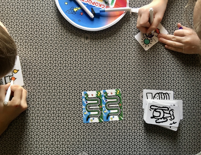 Играли вдвоём со мной, а потом вдвоём с дочкой. Очень тяжело давалось запоминание, почти после каждого переворота карточки на нецветную сторону звучала фраза: «Я уже всё в голове перепутал и забыл». Набрать 12 баллов не удалось ни разу. Особенно мне понравилось, когда дети играли вдвоём. Со мной то у дочки нет шансов, а тут она даже тихонечко подыгрывала, я видела, старалась помедленнее раскрашивать, когда понимала, что одноклассник не успевает. Игра не очень ему понравилась, вторую партию так и не доиграли до конца.