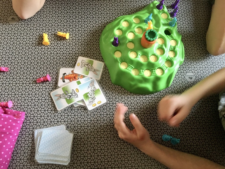 А вот кролики вновь произвели фурор. Эта игра была уже знакома, года три дети играют в неё у нас дома, очень любят, не смотря на то, что взрослеют. Сегодня сыграли несколько партий втроём, а потом настоятельно позвали меня и ещё два раза сыграли вчетвером. Больше всего детям нравится в конце игры расставить зайцев в те лунки, в которых образуются отверстия и быстро-быстро прокрутить морковку, зайцы эффектно падают вниз , зрелище завораживает. У нас механизм сломан, поэтому морковка крутится легко и такой фокус проделать можно.