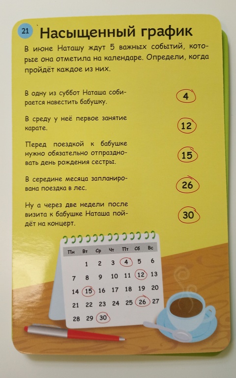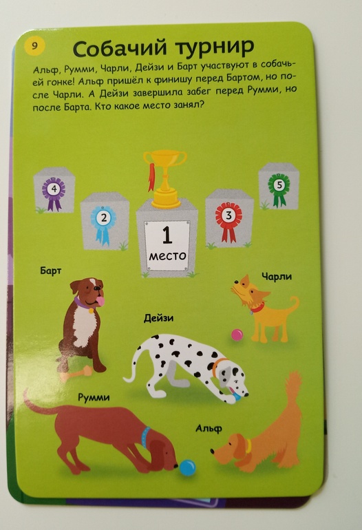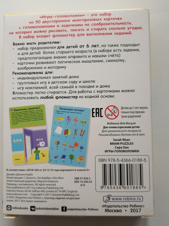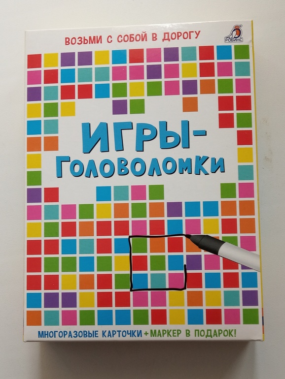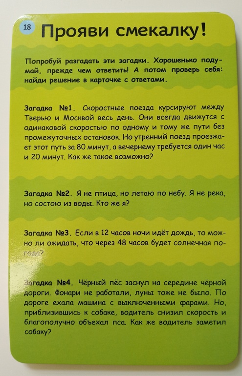 Внутри стопка карточек с разнообразными заданиями. На память, на смекалку, на умение проанализировать информацию, на пространственное мышление. В общем, неплохой набор для детей младшего школьного возраста.