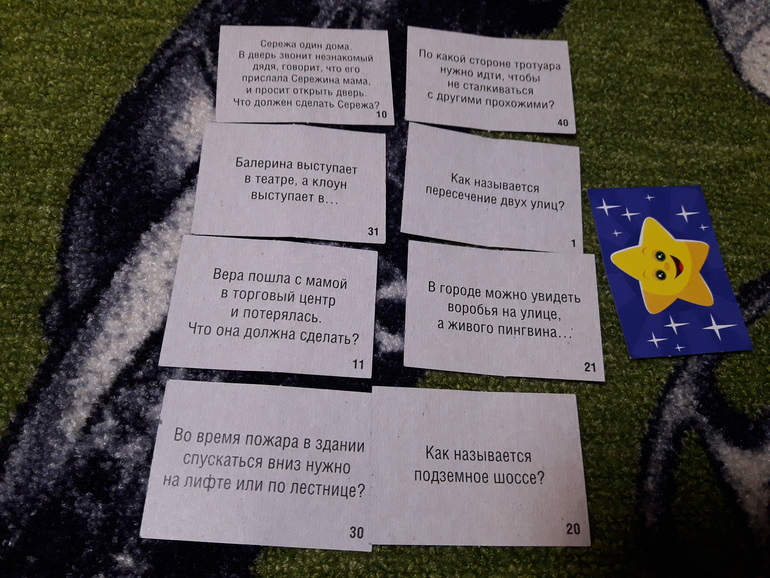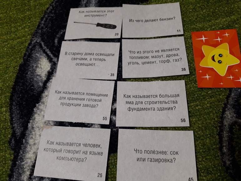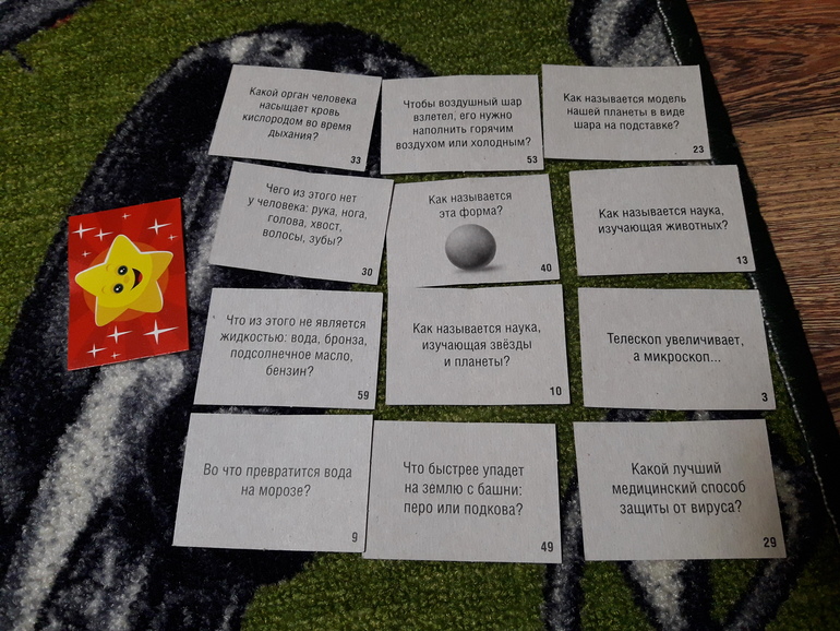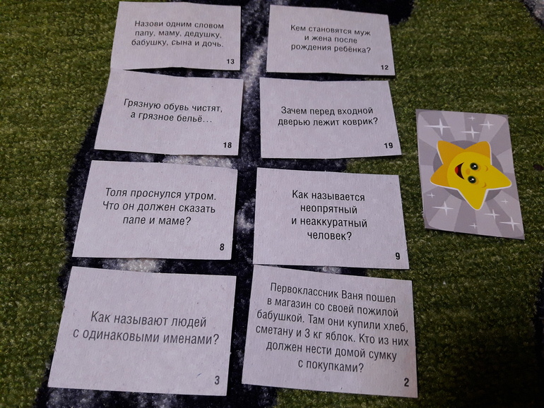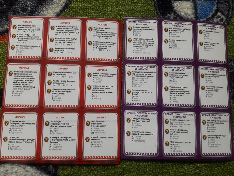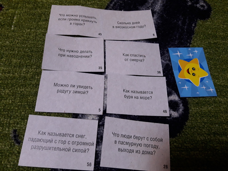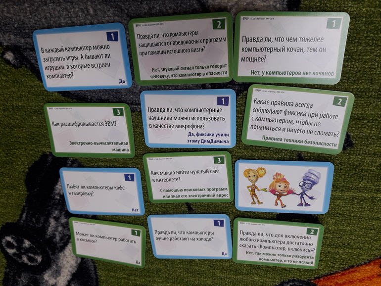 Внутри 2 фиксика, небольшое поле и небольшая стопка двухсторонник карточек. Как я поняла там 3 варианта игры, с карточками синими, зелеными и где фиксики. Я пока не вникала и особо ею не прониклась, просто покажу какие приблизительно вопросы: