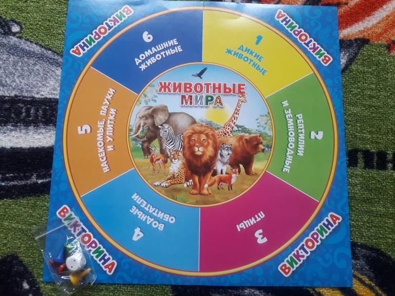Выбор картинок удивил, до сих пор не пойму почему 3 собаки, но 1 кот , например, вообщем я так до сих пор и не поняла по каким принципам их выбрали. Тут уже более познавательно, приходилось и в интернет заглядывать и вспоминать свои истории. Сын многое узнал и повспоминал как он того же петуха у бабушки арбузом кормил, а еще я выяснила ,что он хочет увидеть живого павлина. Ход действий аналогичный первой викторине, только двигаемся вперед/назад после правильных ответов не по цвету, а по значению кубика.