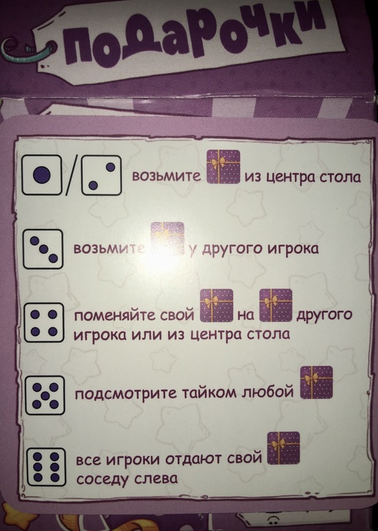 Так же есть в колоде подарков специальные карты. Одна из них, например, позволяет заменить собой любой пункт из списка. А вот две другие не очень хорошие.