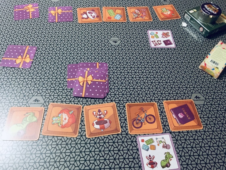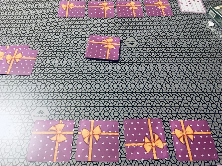 Тоже новинка от Эврикуса. Мемори игра, которая очень сильно мне напоминает какую-то другую игру, но я не могу вспомнить, какую. Каждому игроку достаётся список из четырёх подарков ( позиции могут совпадать в списках). Также перед каждым игроком выкладывается 4 подарка, которые можно подсмотреть в этот момент. Цель: собрать перед собой предметы из списка. В свой ход бросаете кубик и , в зависимости от выпавшего значения, выполняете определенные действия: берёте дополнительные подарки из центральной стопки, меняетесь с другими игроками, берёте без обмена у другого игрока и т.д.