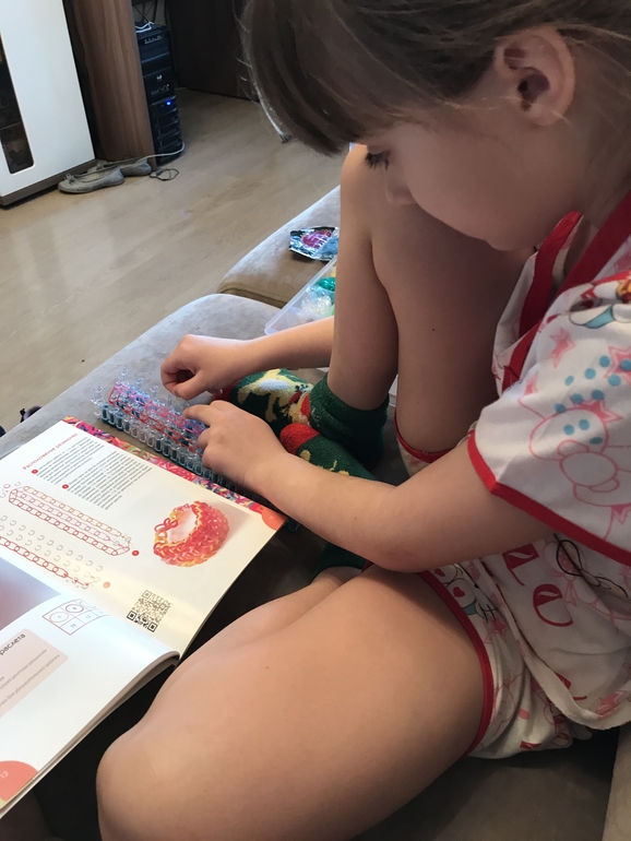 А еще спасает новое увлечение - плетение из резиночек. Дочка изучает книжку, смотрит видеоуроки и осваивает новые способы плетения: