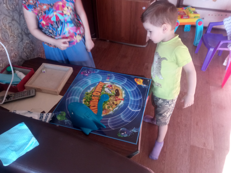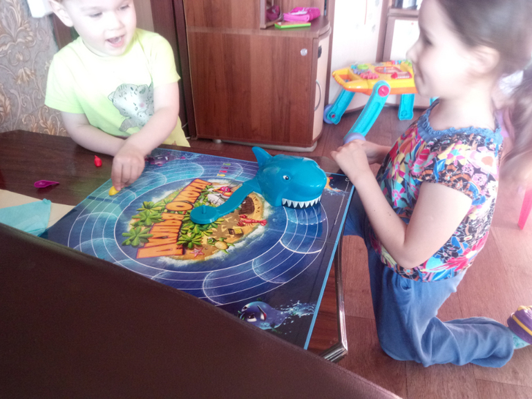Игра, конечно, простая, как 2 копейки, но средний один фиг долго вдупливал, что ему делать. А суть тут такая - выбранные цветные рыбки на старте, акула на своем месте, нажимаем кнопку и сразу бросаем два разноцветных кубика. Чей цвет выпал, тот двигает рыбку на одно деление. В итоге все зависит от бросающего кубики, как быстро он это может делать и как быстро он сможет назвать цвета. Акула в это время неумолимо двигается вперед и пытается запитонить наших Немо, дори и "этих двоих я впервые вижу".