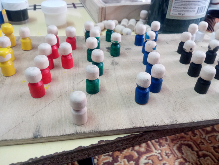А вечером опять пришлось достать новинку - среднего дико клонило в сон, а до отбоя еще был час. Суть такая - сверху медленно быстро, но верно катится шарик, а за это время надо собрать башенку из фигурок. Но собрать ее не просто - выпуклости и впуклости часто не совпадают, так что соображать надо быстро.