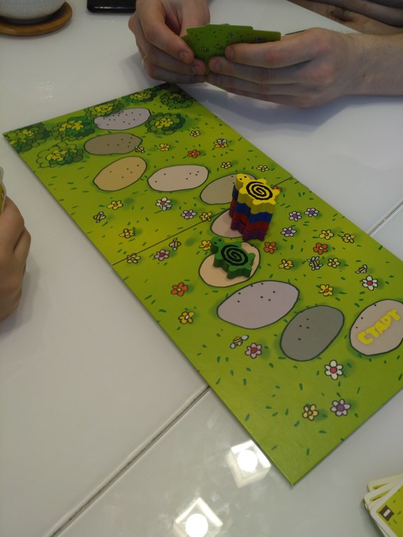 Вчера и сегодня играли вчетвером в Черепашьи бега по пару партий, Даша быстро уловила суть, конечно ещё не конкурент нам, но какая ее черепаха мы до конца игры не знаем. Там где нужна хитрость ей вообще нет равных!!