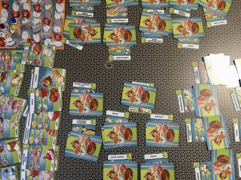 На волне вчерашнего феерического успеха решили повторить. Но партия вышла совершенно непохожей. Какие рецепты уплывали в виде продуктов в холодильник! Ни одного сложного блюда за 8 победных очков так и не получилось ни у кого приготовить. Всю вторую половину партии мы с сыном ожидали томатный соус, который могла приготовить дочка, в итоге, мой юный соперник увёл у меня из-под носа такой долгожданный ингредиент. Всю партию чувствовалась какая-то безысходность. Удивительно, как одна и та же игра способна подарить совершенно разные эмоции. Выиграла дочка, на втором месте я, сын, соответственно, на третьем. Счёт 52-47-46.