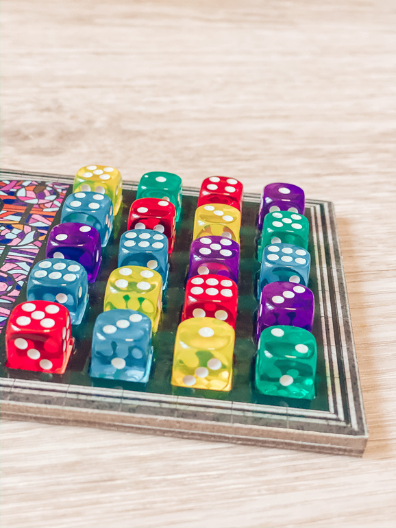 Достали Саграду. В этот раз цели были сложные, нужно было собрать ряды из разных цветов горизонтально, собирать столбики разной яркости и накопить много комбинаций 3-4. За разноцветную строчку давали аж 6 очков. Я пустилась собирать их. И все было бы хорошо, если бы я не забыла про остальные цели). Получилось, что сосредоточилась на самой сложной и дорогой, а остальные вообще не учитывала. Собрать все ряды из пяти кубиков разных цветов сложно. Я смогла собрать три, а четвёртый не удалось, потому что в последний ход мне достались кубики, которые по правилам я не могла поставить в единственное пустое место. Так мой ряд оказался не завершён и по итогам я набрала всего лишь 45 очков. Младшая дочь вроде неплохо собирала, но когда я начала считать ее очки, то заметила сразу две ошибки в выставлении кубиков. Пришлось ей убрать их с поля совсем и у нее вышло всего 36 очков. Старшая сыграла не плохо и заработала на всем по-немногу, на личных целях и на общих. Она обошла меня с 51 очками. А муж в этот раз набрал много очков на личной цели. Выкладывал желтые кубики со значениями пять и шесть. Но и собрать три разноцветных ряда тоже смог.