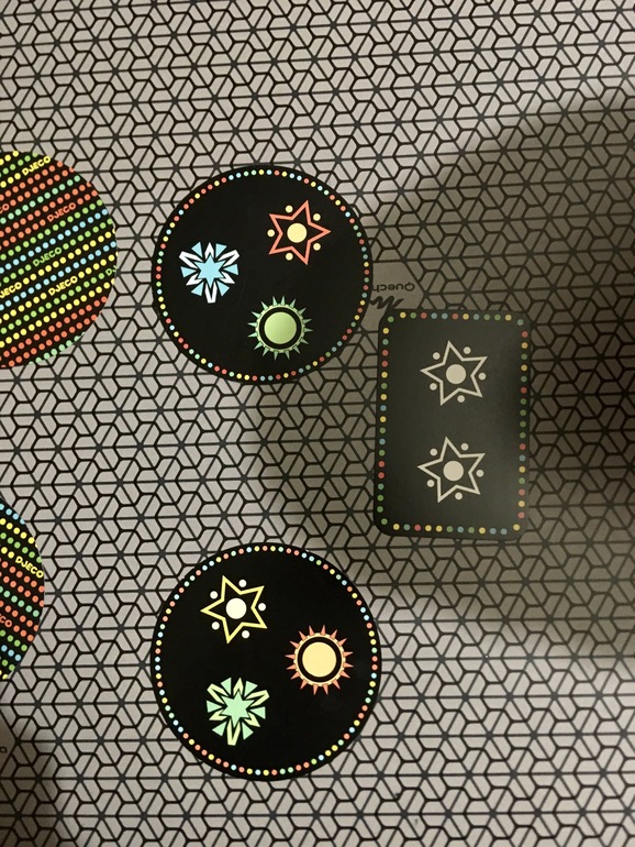или несколько (от 1 до 3) фигур любого цвета (на фото - 2 белые фигуры, значит нужно найти на круглых картах две такие же любого цвета).