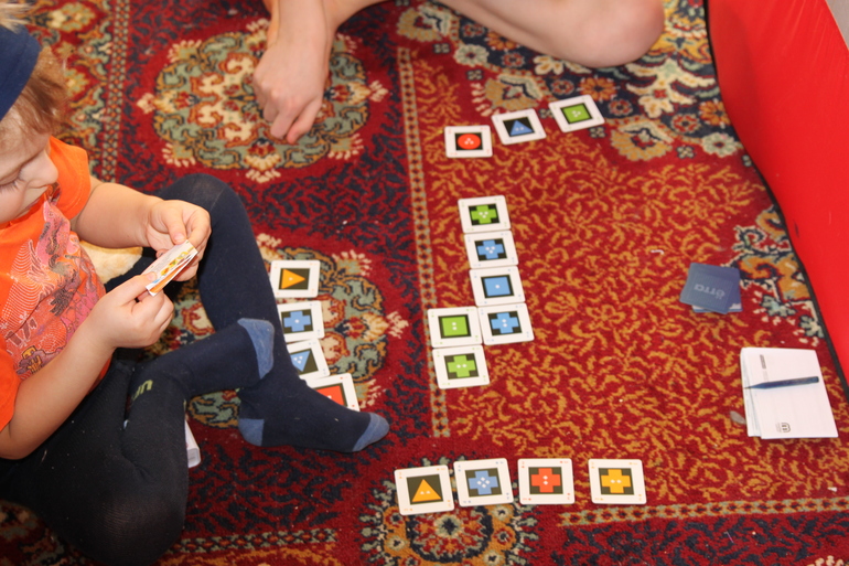 Сыграли 2 партии, дочка выиграла оба раза. То ли она запоминает так хорошо, то ли ей с картами везет (бывает так, что нашел цветную фигуру, открываешь следующую карту, а там та же фигура, но белая, то есть можно любой цвет открыть, соответственно переворачиваешь ту же круглую карту, что и в предыдущий ход).