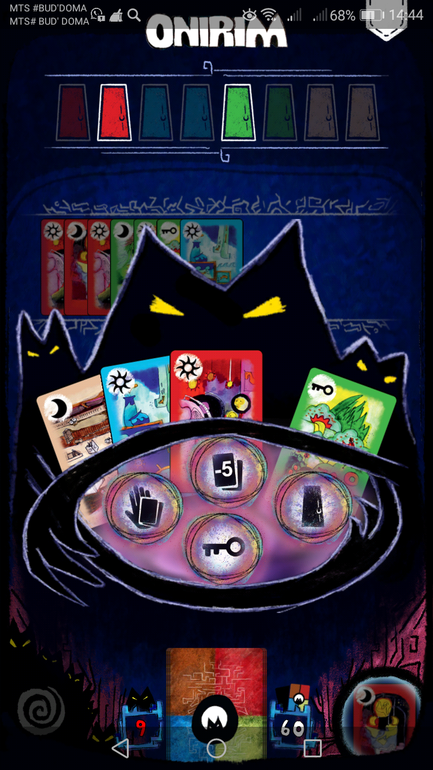 Морковкина подробно описывала процесс игры, поэтому я лишь кратко напомню. 8 круглых карт перевернуты рубашкой вверх. Открывается прямоугольная карта, и в зависимости от ее рисунка мы ищем соответствие - или такую же фигуру того же цвета (любую из двух),