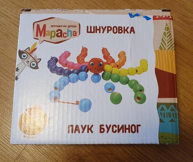 Называется "Паук-бусиног", производитель Mapacha. Бусины деревянные, яркие, подходящего размера и вполне приличного качества (не хуже, чем в тропинках, это точно).
