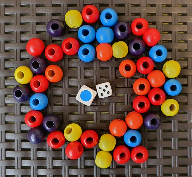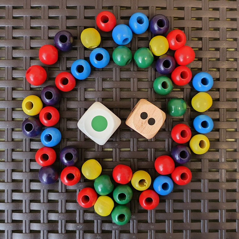 Все точно так же: по очереди бросаем кубики и нанизываем бусины на свои шнурочки в соответствие с выпавшей комбинацией.