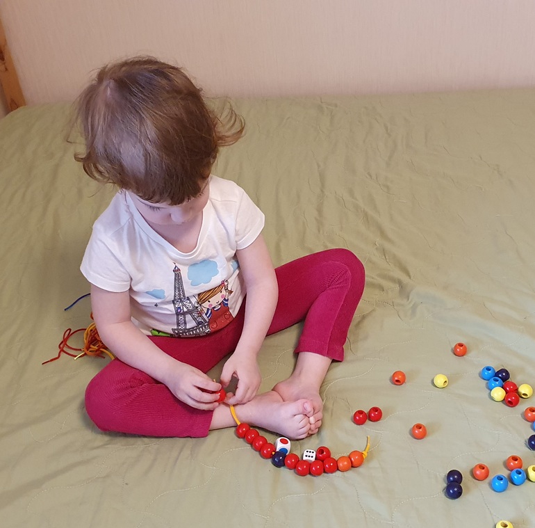 Если детям не надоест нанизывать бусины на шнурки (надо сказать, они откровенно кайфуют от этого), потом ещё нарисую карточки.