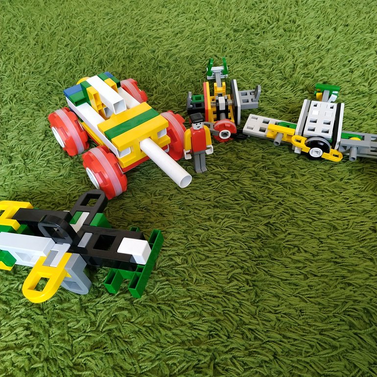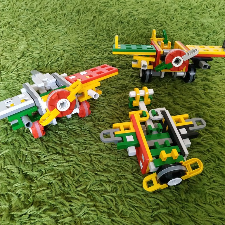 Сейчас прямо таки самолетная тема. Вообще у нас собрано три вида этого конструктора. Совсем малышовый, там очень крупные детали, видно по танку и два вида более мелкого- серый и желто-красно-зеленый. Пропеллеры крутятся, колеса едут.
