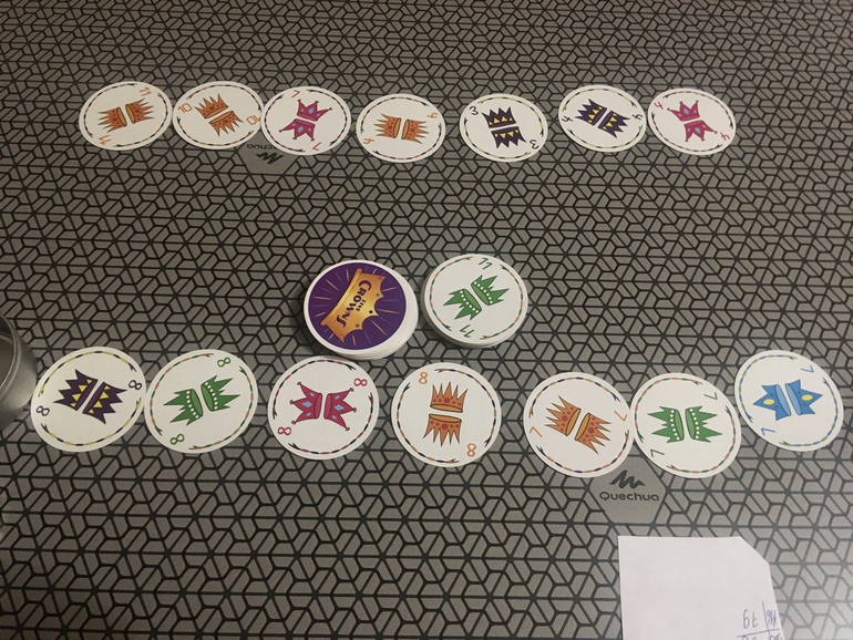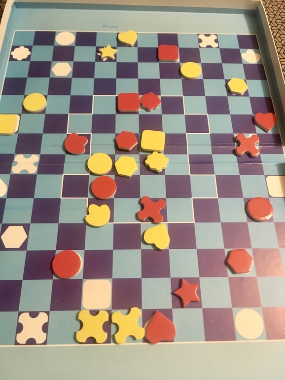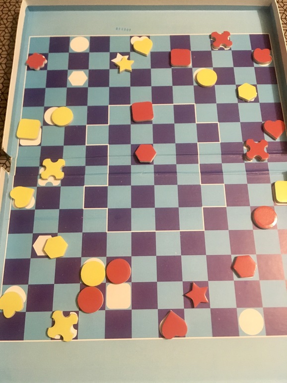Бюджетная игра от Десятого королевства уходящая корнями в Советский Союз. В то время игру и производили, в коробке было плотное поле и приятные фишки. Сейчас, конечно, качество соответсвует 150 руб, которые я заплатила за игру. Но сама идея довольно любопытна. У двух участников абсолютно одинаковый набор фишек, которые выставляются в центре поля. Задача : первым привести все свои фигуры на подходящие клетки с белыми символами. Ходить можно во всех направлениях и по диагонали, в том числе. На одну клетку. Либо перепрыгивать через другие фигуру, приземляясь за ними на пустое пространство.