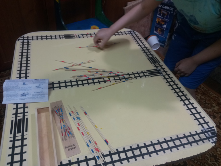Крайне непонятно, как в ней можно не пошевелить соседние палки. Но, хоть доча и вытянула МикАдо (только сегодня узнал, что ударение на А, а не на О), по очкам она продула. Так как времени было в обрез, то больше ни во что играть и не стали - ванна звала к себе. Точнее, это мама звала всех в ванну.