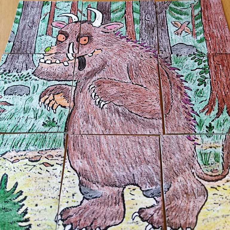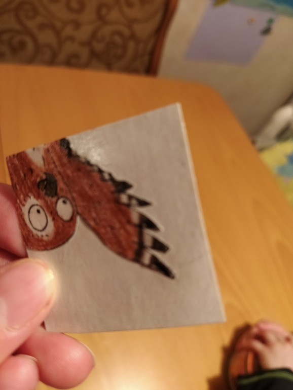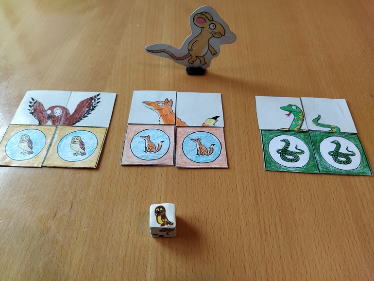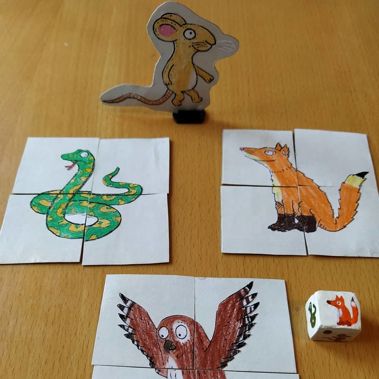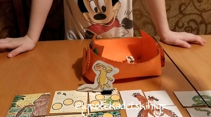 Все сделала, но что-то напутала- сам Груффало переворачивался у меня не правильно- пришлось переделывать. Кубик делала из белой глины, разрисовал акрилом и покрыла лаком. И игру решила тоже покрыть тонким слоем, чтоб ее не порвали т.к. это просто листы А4, а внутри ещё два листа картона. Картон не влез в принтер, пришлось печатать просто на листах. Мне очень понравилось. И края покрыла-лак же ещё заклеивает. Его используют авиамоделисты иногда именно для этого. Поэтому 4 слоя этой склейки я превратила в один и сама игра стала прочной. Чем лучше проклейка листов, тем лучше ложится лак и покрывать нужно тоже очень тонким слоем, чтоб он не размочил бумагу. Единственное извела суперклей т.к. к А4 картон другим клеем клеется ужасно - размокает и становится волнами. Суперклей подошел идеально.