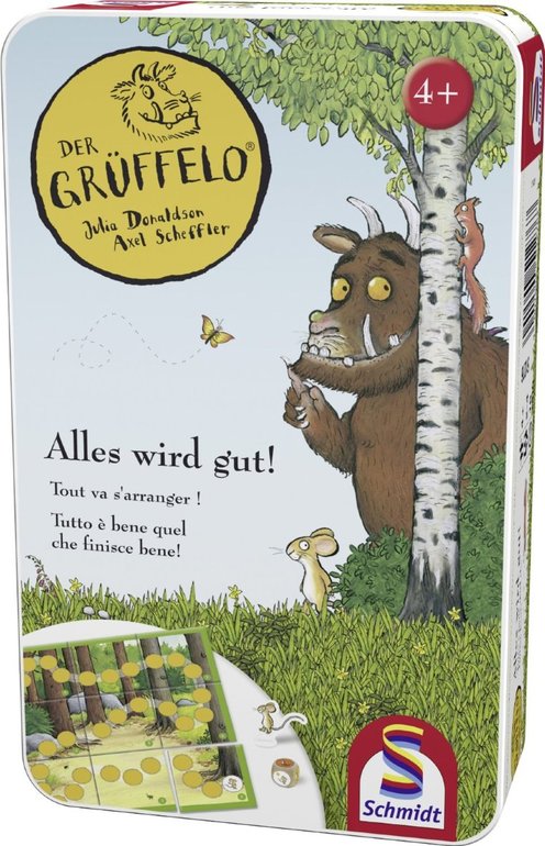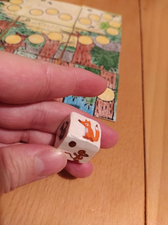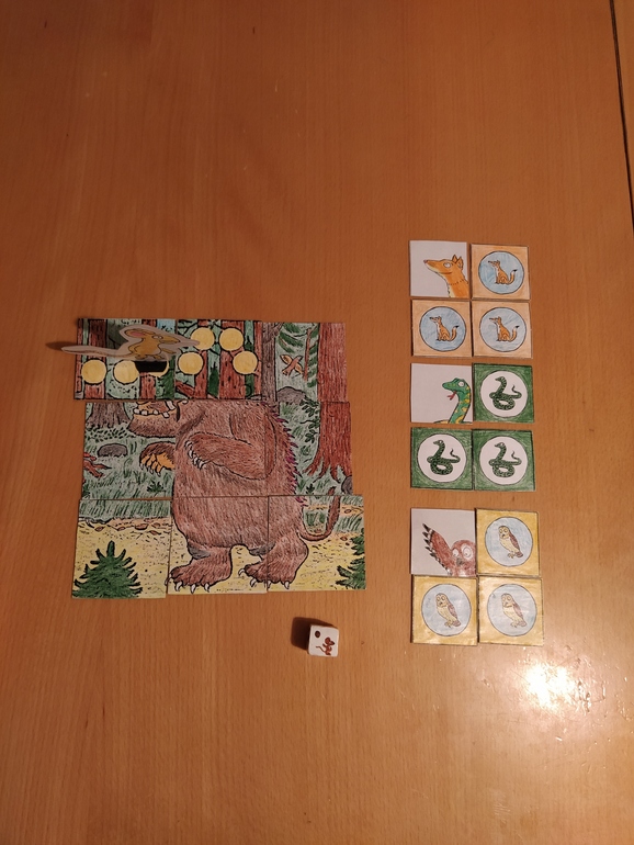 На трёх гранях кубика мышонок, который ходит по полю 1, 2 или 3 раза, что укажет кубик. На трёх других - Лиса, Змея и Сова, которые открываются, когда выпадают их изображения на кубике. Если все карточки у одного из героев уже открыты - переворачивается клеточка самого поля по порядку, на обратной стороне поля изображен Груффало.
