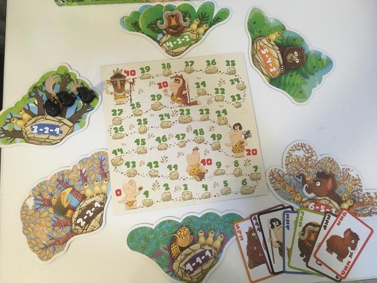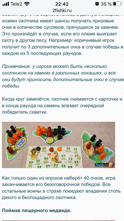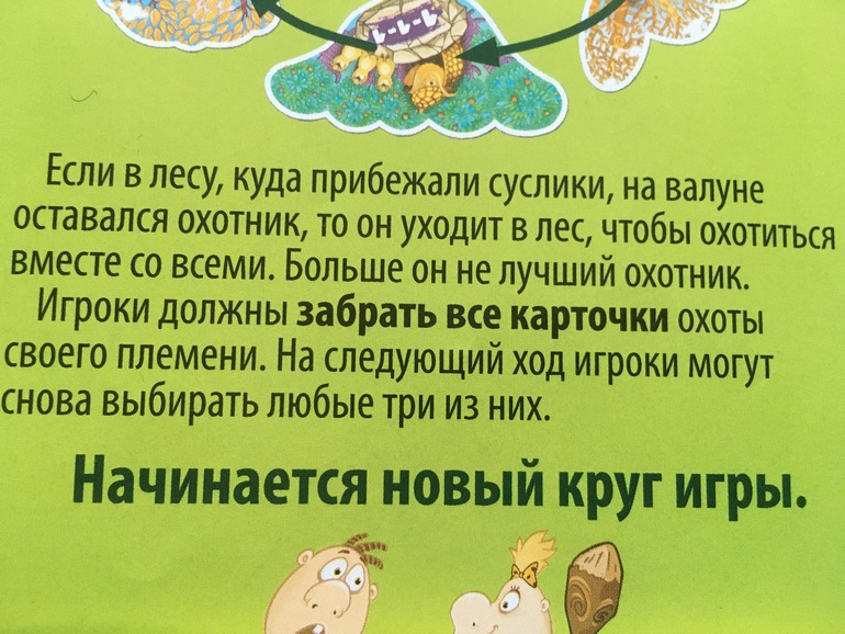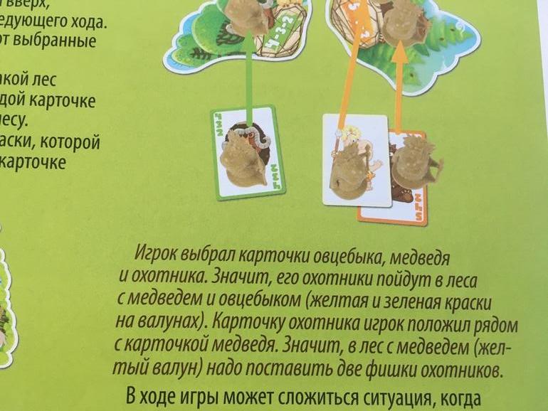 Затем, как муж освободился, сын предложил игру «Большая охота». Игроки выбирают из своих карт три, вскрывают их одновременно и размещают одного или двух охотников в шесть лесов на их выбор. Каждый раунд один лес активен, в нем происходит подсчёт охотников, игрок с большим количеством охотников получает наибольшие баллы в этом лесу (написаны на валуне) и оставляет одного охотника в этом лесу (мы его оставляем в лежачем положении). Это даёт игроку возможность получать дополнительные баллы в количестве равном количеству сусликов, изображённых у валуна, до тех пор пока игроки снова не вернутся в этот лес. Второй игрок получает баллы равные второй цифре на валуне в лесу. При ничьей баллы тоже равны второй цифре. Затем нужно передвинуть фишки по полю на заработанное количество баллов. Муж играл раньше в неё, но забыл напрочь правила. Первый раз играл просто выкладывая любые карты, к середине игры понял, что к чему, стал выкладывать карты осознанно. В общем доигрывали уже в полную силу. Сразу сыграли ещё два раза. Сфотографировать во время игры забыла.