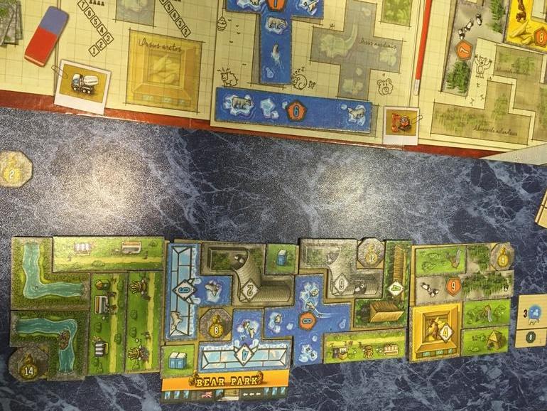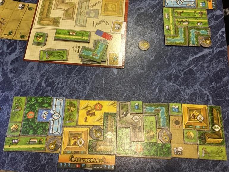 Вчера играли уже не в первый раз, с каждым разом игра проходит все напряженнее, все стали продумывать какие-то свои стратегии, также меняем виды достижений. Смысл игры- выкладывать тайлы, создавая свой парк с медведями, беря новые тайлы в зависимости от того, какие символы накрыли последним тайлом. В конце подсчитываются баллы.