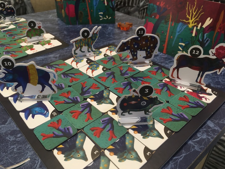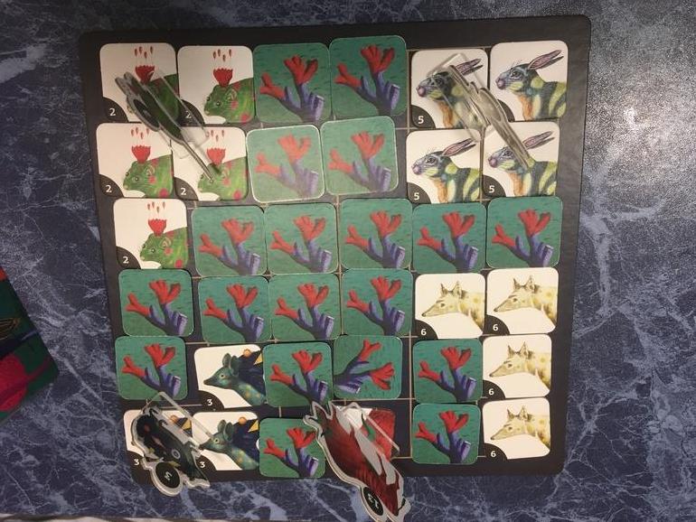 Игра для 2-4 человек, от 8 лет. Игра российских авторов. Буквально пару слов о правилах, может кому-то поможет определиться. В центр стола кладётся поле-счётчик очков с фишками. Тайлы двусторонние, они кладутся в мешочек, по 6 тайлов раздаются каждому игроку и в центр стола. Тайлы игроки прячут за ширмой. Каждому игроку выдаётся поле, на которое нужно выкладывать группы зверей одного типа, ограждая их от других групп животных растениями или краем поля. В свой ход игрок выбирает цифру на поле и все игроки должны выложить туда тайл либо стороной с животным, либо с растением. Если тайл выложен стороной с растением, то можно взять ещё 2 тайла из мешочка или из открытых тайлов. Если же стороной с животным- то тайлы брать нельзя. Плюс, если у игрока в наличии остался только один файл, ему придётся выложить его растением, даже, если ему это не выгодно. Каждый раз как у игрока закрывается участок с животным, ему полагается фигурка животного с баллами (баллы указаны и на каждом тайле), + в зависимости от количества выложенных животных добавляется от 0до 40 победных очков.